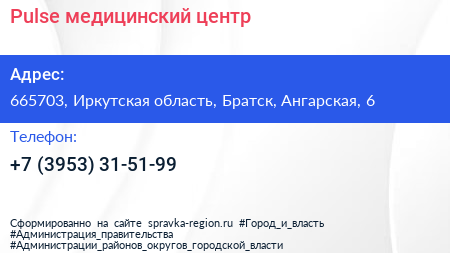 Pulse, медицинский центр по адресу 665703, Иркутская область, Братск, Ангарская, 6 в дальнейшем Организация, размещена в следующих категориях: