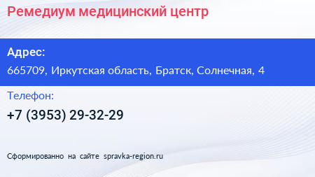 Ремедиум, медицинский центр по адресу 665709, Иркутская область, Братск, Солнечная, 4 в дальнейшем Организация, размещена в следующих категориях: