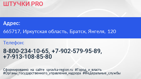 ШТУЧКИ.PRO по адресу 665717, Иркутская область, Братск, Янгеля, 120 в дальнейшем Организация, размещена в следующих категориях: