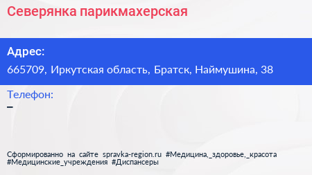Северянка, парикмахерская по адресу 665709, Иркутская область, Братск, Наймушина, 38 в дальнейшем Организация, размещена в следующих категориях: