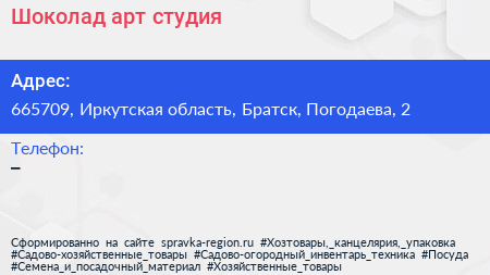 Шоколад, арт-студия по адресу 665709, Иркутская область, Братск, Погодаева, 2 в дальнейшем Организация, размещена в следующих категориях: