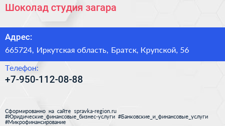Шоколад, студия загара по адресу 665724, Иркутская область, Братск, Крупской, 56 в дальнейшем Организация, размещена в следующих категориях: