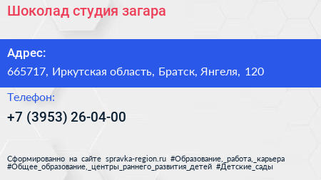 Шоколад, студия загара по адресу 665717, Иркутская область, Братск, Янгеля, 120 в дальнейшем Организация, размещена в следующих категориях: