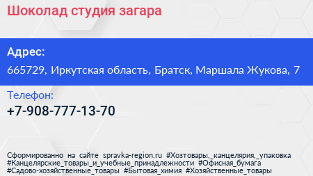 Шоколад, студия загара по адресу 665729, Иркутская область, Братск, Маршала Жукова, 7 в дальнейшем Организация, размещена в следующих категориях: