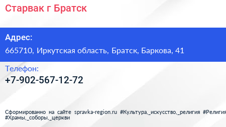 Старвак, г. Братск по адресу 665710, Иркутская область, Братск, Баркова, 41 в дальнейшем Организация, размещена в следующих категориях: