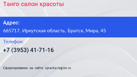 Танго, салон красоты по адресу 665717, Иркутская область, Братск, Мира, 45 в дальнейшем Организация, размещена в следующих категориях: