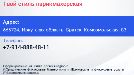 Твой стиль, парикмахерская по адресу 665724, Иркутская область, Братск, Комсомольская, 83 в дальнейшем Организация, размещена в следующих категориях: