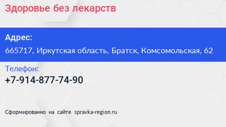 Здоровье без лекарств по адресу 665717, Иркутская область, Братск, Комсомольская, 62 в дальнейшем Организация, размещена в следующих категориях: