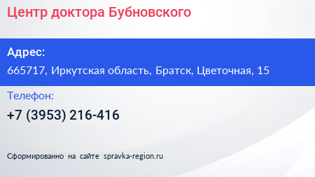 Центр доктора Бубновского по адресу 665717, Иркутская область, Братск, Цветочная, 15 в дальнейшем Организация, размещена в следующих категориях:
