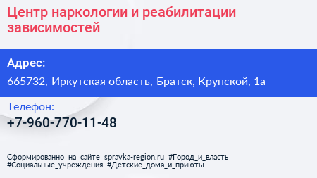 Центр наркологии и реабилитации зависимостей по адресу 665732, Иркутская область, Братск, Крупской, 1а в дальнейшем Организация, размещена в следующих категориях: