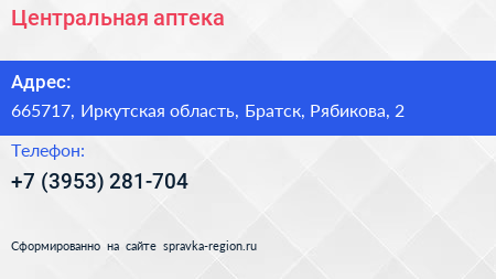 Центральная аптека по адресу 665717, Иркутская область, Братск, Рябикова, 2 в дальнейшем Организация, размещена в следующих категориях: