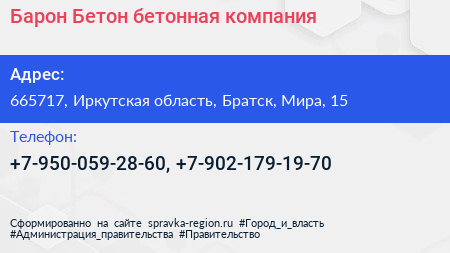 Барон Бетон, бетонная компания по адресу 665717, Иркутская область, Братск, Мира, 15 в дальнейшем Организация, размещена в следующих категориях: