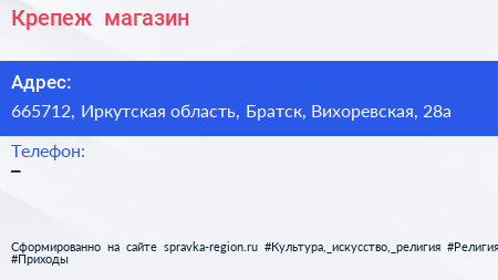 Крепеж+, магазин по адресу 665712, Иркутская область, Братск, Вихоревская, 28а в дальнейшем Организация, размещена в следующих категориях: