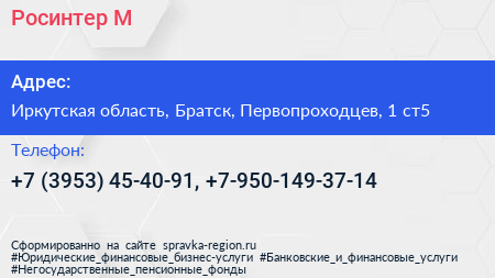 Росинтер М по адресу Иркутская область, Братск, Первопроходцев, 1 ст5 в дальнейшем Организация, размещена в следующих категориях: