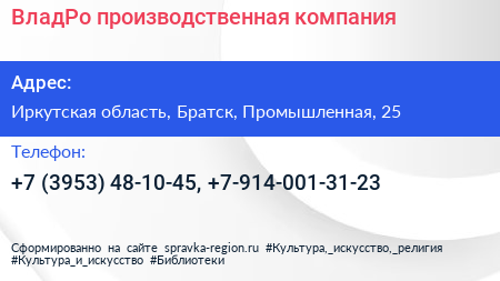 ВладРо, производственная компания по адресу Иркутская область, Братск, Промышленная, 25 в дальнейшем Организация, размещена в следующих категориях: