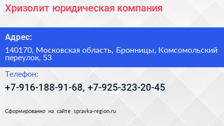 Хризолит, юридическая компания по адресу 140170, Московская область, Бронницы, Комсомольский переулок, 53 в дальнейшем Организация, размещена в следующих категориях: