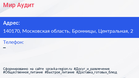 Мир-Аудит по адресу 140170, Московская область, Бронницы, Центральная, 2 в дальнейшем Организация, размещена в следующих категориях: