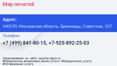 Мир печатей по адресу 140170, Московская область, Бронницы, Советская, 157 в дальнейшем Организация, размещена в следующих категориях: