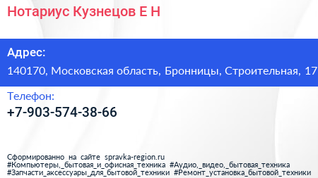 Нотариус Кузнецов Е.Н. по адресу 140170, Московская область, Бронницы, Строительная, 17 в дальнейшем Организация, размещена в следующих категориях: