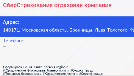 СберСтрахование, страховая компания по адресу 140171, Московская область, Бронницы, Льва Толстого, 9а в дальнейшем Организация, размещена в следующих категориях: