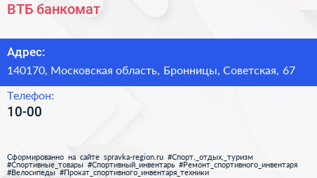 ВТБ, банкомат по адресу 140170, Московская область, Бронницы, Советская, 67 в дальнейшем Организация, размещена в следующих категориях: