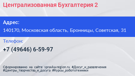 Централизованная Бухгалтерия №2 по адресу 140170, Московская область, Бронницы, Советская, 31 в дальнейшем Организация, размещена в следующих категориях: