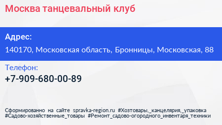Москва, танцевальный клуб по адресу 140170, Московская область, Бронницы, Московская, 88 в дальнейшем Организация, размещена в следующих категориях: