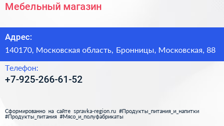 Мебельный магазин по адресу 140170, Московская область, Бронницы, Московская, 88 в дальнейшем Организация, размещена в следующих категориях: