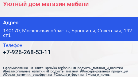 Уютный дом, магазин мебели по адресу 140170, Московская область, Бронницы, Советская, 142 ст1 в дальнейшем Организация, размещена в следующих категориях: