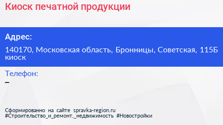 Киоск печатной продукции по адресу 140170, Московская область, Бронницы, Советская, 115Б киоск в дальнейшем Организация, размещена в следующих категориях: