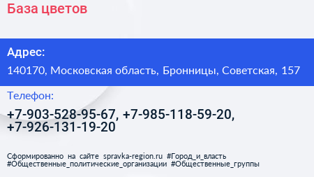 База цветов по адресу 140170, Московская область, Бронницы, Советская, 157 в дальнейшем Организация, размещена в следующих категориях: