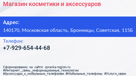 Магазин косметики и аксессуаров по адресу 140170, Московская область, Бронницы, Советская, 115Б в дальнейшем Организация, размещена в следующих категориях: