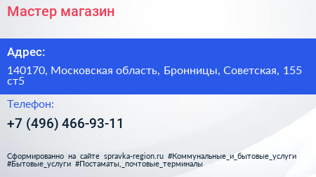 Мастер, магазин по адресу 140170, Московская область, Бронницы, Советская, 155 ст5 в дальнейшем Организация, размещена в следующих категориях: