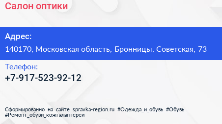 Салон оптики по адресу 140170, Московская область, Бронницы, Советская, 73 в дальнейшем Организация, размещена в следующих категориях: