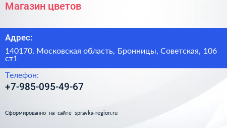 Магазин цветов по адресу 140170, Московская область, Бронницы, Советская, 106 ст1 в дальнейшем Организация, размещена в следующих категориях: