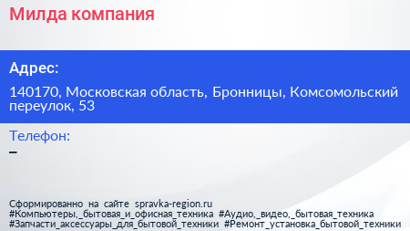 Милда, компания по адресу 140170, Московская область, Бронницы, Комсомольский переулок, 53 в дальнейшем Организация, размещена в следующих категориях: