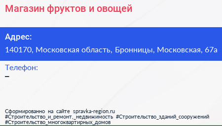 Магазин фруктов и овощей по адресу 140170, Московская область, Бронницы, Московская, 67а в дальнейшем Организация, размещена в следующих категориях: