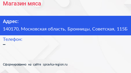 Магазин мяса по адресу 140170, Московская область, Бронницы, Советская, 115Б в дальнейшем Организация, размещена в следующих категориях: