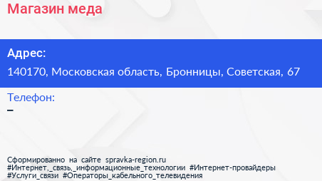 Магазин меда по адресу 140170, Московская область, Бронницы, Советская, 67 в дальнейшем Организация, размещена в следующих категориях: