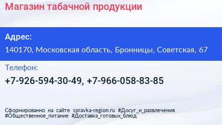 Магазин табачной продукции по адресу 140170, Московская область, Бронницы, Советская, 67 в дальнейшем Организация, размещена в следующих категориях: