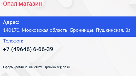 Опал, магазин по адресу 140170, Московская область, Бронницы, Пушкинская, 3а в дальнейшем Организация, размещена в следующих категориях: