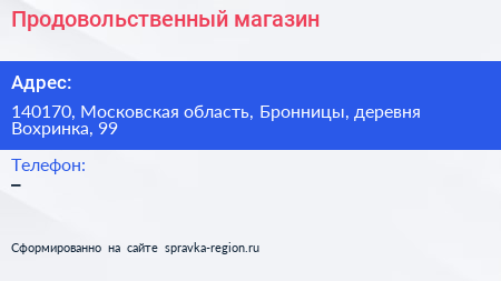 Продовольственный магазин по адресу 140170, Московская область, Бронницы, деревня Вохринка, 99 в дальнейшем Организация, размещена в следующих категориях:
