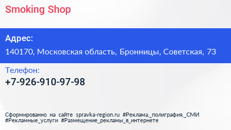 Smoking Shop по адресу 140170, Московская область, Бронницы, Советская, 73 в дальнейшем Организация, размещена в следующих категориях: