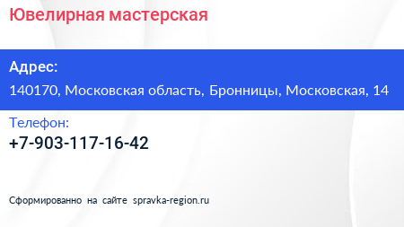 Ювелирная мастерская по адресу 140170, Московская область, Бронницы, Московская, 14 в дальнейшем Организация, размещена в следующих категориях: