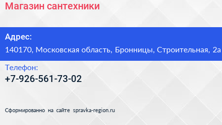 Магазин сантехники по адресу 140170, Московская область, Бронницы, Строительная, 2а в дальнейшем Организация, размещена в следующих категориях: