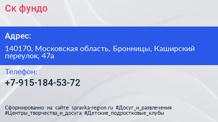 Ск-фундо по адресу 140170, Московская область, Бронницы, Каширский переулок, 47а в дальнейшем Организация, размещена в следующих категориях: