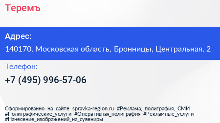 Теремъ по адресу 140170, Московская область, Бронницы, Центральная, 2 в дальнейшем Организация, размещена в следующих категориях: