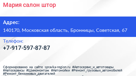 Мария, салон штор по адресу 140170, Московская область, Бронницы, Советская, 67 в дальнейшем Организация, размещена в следующих категориях: