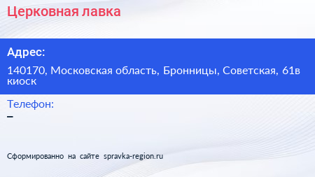 Церковная лавка по адресу 140170, Московская область, Бронницы, Советская, 61в киоск в дальнейшем Организация, размещена в следующих категориях: