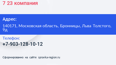 7-23, компания по адресу 140171, Московская область, Бронницы, Льва Толстого, 9д в дальнейшем Организация, размещена в следующих категориях: